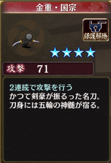 金重・国宗:攻撃71、特殊効果なし。解説は「2連続で攻撃を行う。かつて剣豪が振るった名刀。刀身には五輪の神髄が宿る」