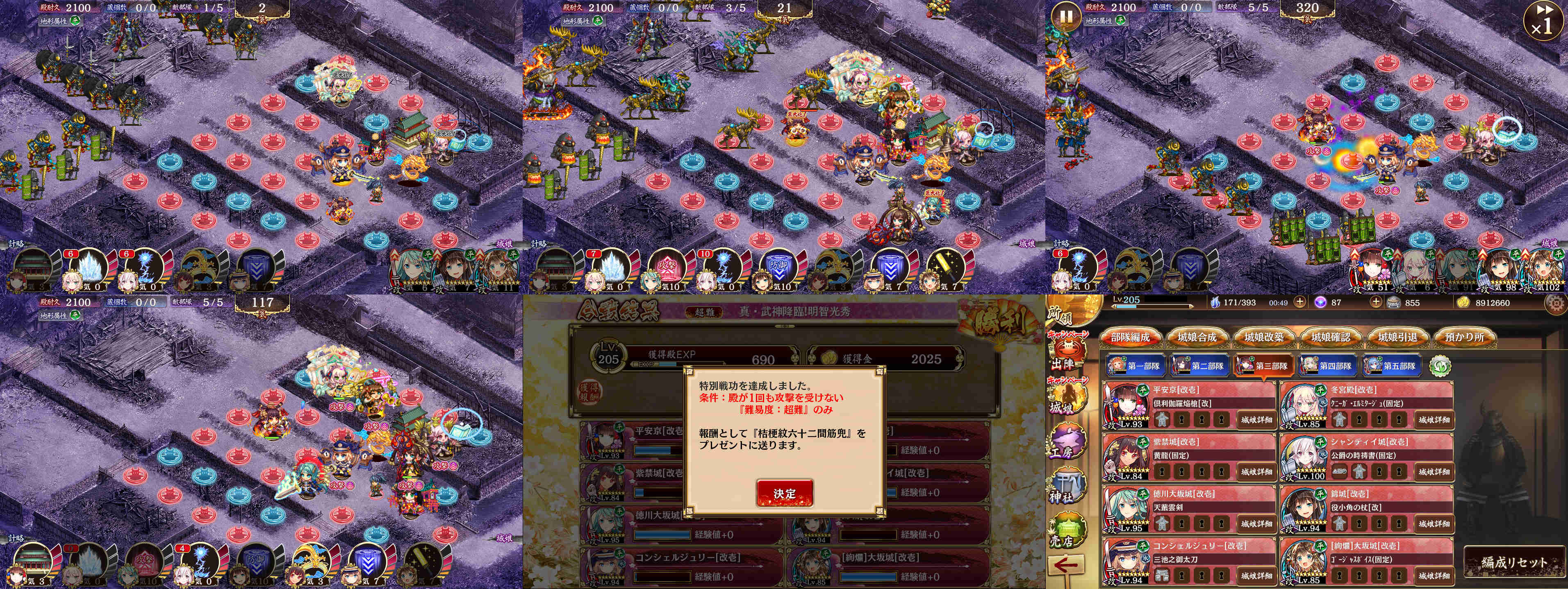 動画も参考に、明智光秀超難全戦功。配置は27→32平安、34シャンティイ、24→33→12紫禁、21→21冬宮殿、23コンシェ、28→31錦、26→26絢爛大坂、32→18徳坂。序盤の騎馬突撃には、コンシェ最大化後の計略で対処。イタチの群れには、徳坂計略を本二人に掛けた後の計略で対処。明王には徳坂計略と錦計略と絢爛大坂トークンのデコイで対処。ボス光秀の覚醒前に絢爛大坂を撤退させ、前3人に徳坂計略。覚醒後直ぐに冬宮殿計略&錦計略&錦の撤退。デコイトークン3体を撃たせて、コンシェの攻撃モーションで自計略を撃つ。次の光秀の攻撃に合わせて冬宮殿のうつせみ撤退&紫禁トークンを置いたら、次の攻撃が入る前に撃破出来る。その後は適所に再配置し直し、第2戦へと移る。