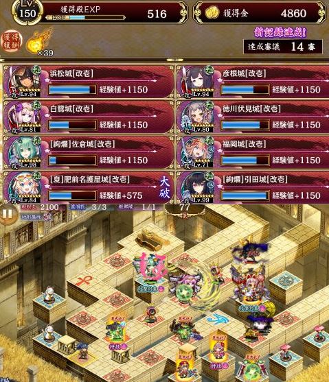 14審。福岡城の再配置短縮バフと徳川伏見の速度隙増加デバフ効果でvs北条の2発を空蝉で回避する編成。遠距離2枚で空蝉ループ可能。彦根、浜松、ふっくー、佐倉、徳川伏見、名護屋、引田(ユカリ武器)の順に配置。最初は浜松で彦根特技発動。ネコを置く。白鷺の大破特技などを駆使して進行を遅らせ佐倉の最大化を目指す。佐倉計略はかけっぱ。次に徳川伏見を最大化させて次は白鷺。北条を倒すまで3人だけ最大化。切りつけてくる隠密忍者は浜松置いたり引田トークンで対処。北条は名護屋と引田で空蝉ループ。最後に下から来る忍者には空蝉で使った引田を16に置いて最大化させ18にトークン配置が間に合えばトラさんを頑張って倒してもトラさんおかわりが間に合う。あとは焼くなり何なりと。