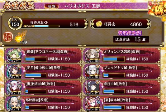 15審。初手16絢爛アラゴを裏坂本の気軽減補助で即最大化。以降は計略かけっぱ。10に裏さわわで序盤は2回巨大化してルート上の敵を処理。都こおり14、春日山17、プレッドヤマ18。落ち着いたら裏さわわ3回目の巨大化で明王を削る。オリュを2回大破させる。大破後はオリュを18で最大化させる。プレッドヤマは13に移動して1人空蝉でボスと明王戦で活躍してもらう。