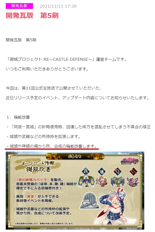 9か月前の改善予定だけどまだだね。一応このあと預かり所弐ができてレイアウト変わったけど、所持枠拡張の部類だしユーザー次第で改悪にもなってたし、合成の機能改善はどのみち来てないね。