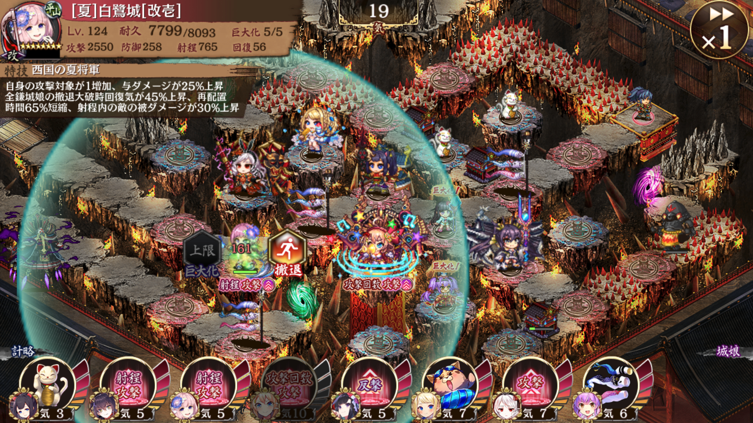 画像は極端に射程を盛った例だが、5夏白鷺城の攻撃が待機中の毛利に届くので余裕で撃破可能。後は騎馬兵の類に夏白鷺が大破させられないように対処すれば楽に15審取れる。