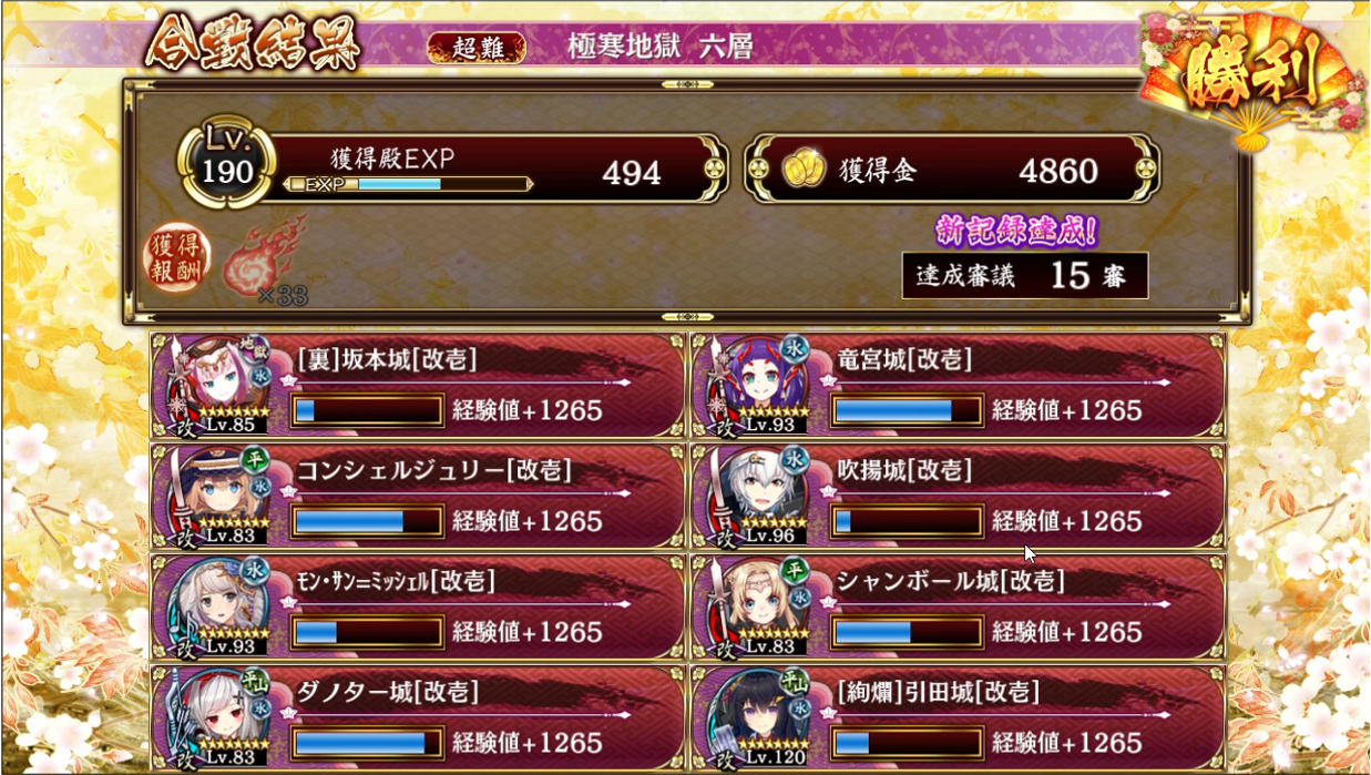 鬼ヶ島も季節限定も持ってないから無しで15審クリア。やっぱり耐久するなら引田城が役に立ってくれるね。配置は4吹揚14裏坂本13シャンボール9竜宮16モンサン20ダノター12引田11コンシェ。