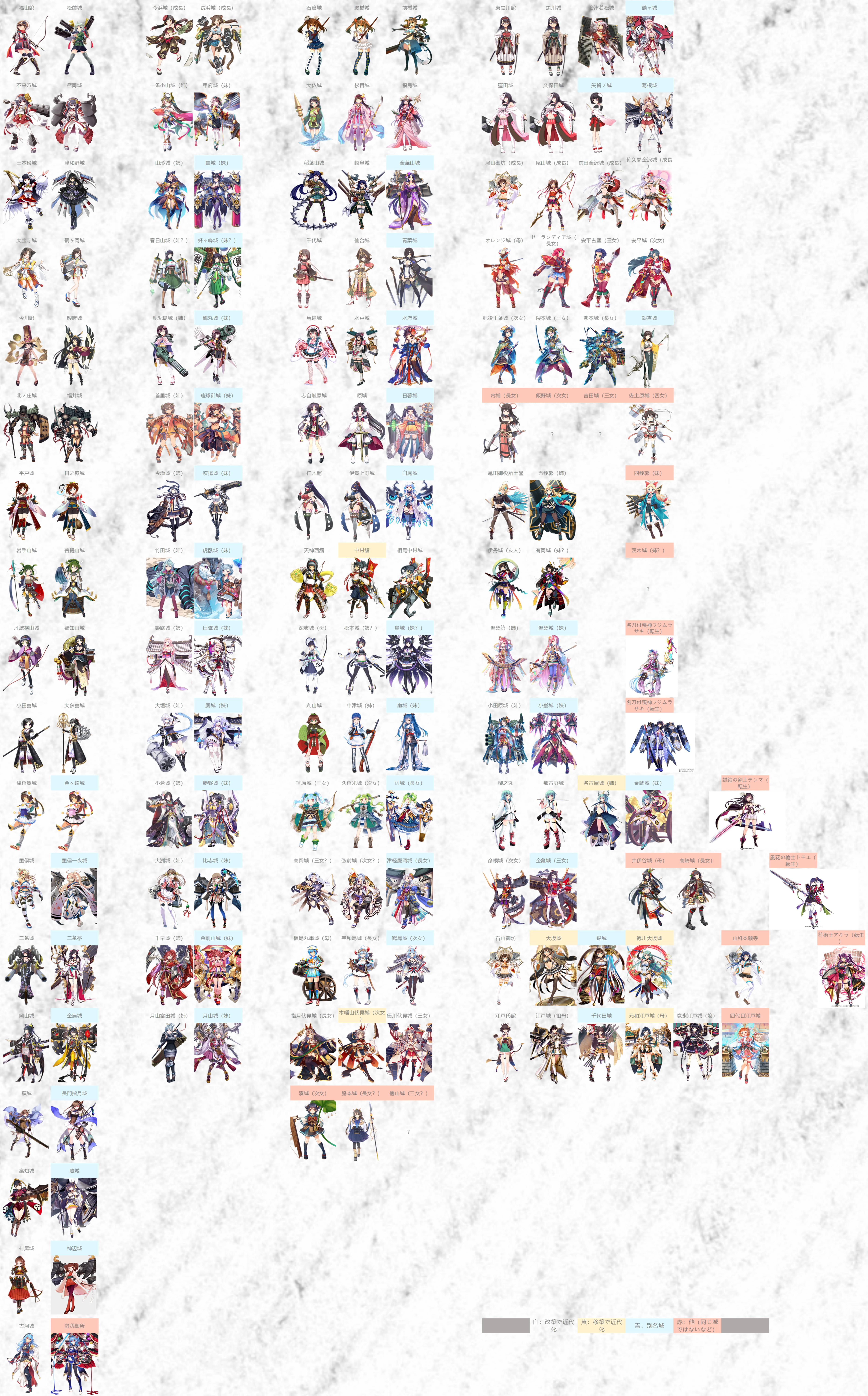 城娘の姉妹関係表といったものがwikiには載せていないから、ちょっとだけやってみたけど。浅はかなので脱落や誤りだらけってのは予想できるんだな…