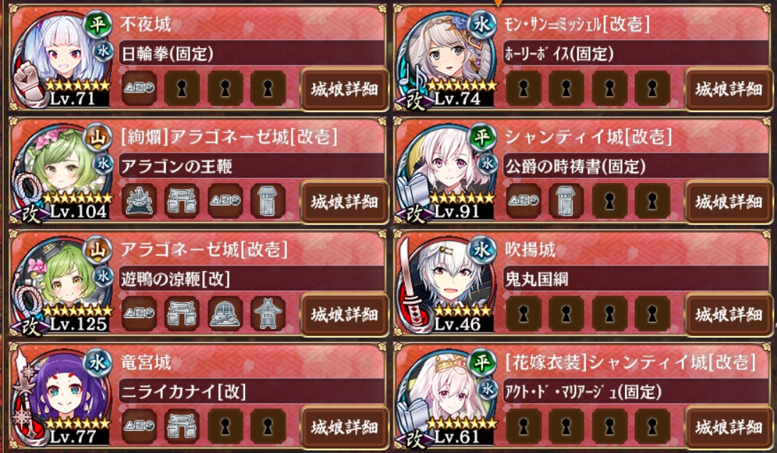 参考にしつつ?12審突破。メンバーと入れた審議。12に絢爛アラゴ入れて大体吹っ飛ばした。20と8にシャンティ置いて6アラゴ10吹揚18竜宮15モンサン。飛行系とタコはダメ計使いつつダメージそれなりに食らったら撤退・再配置