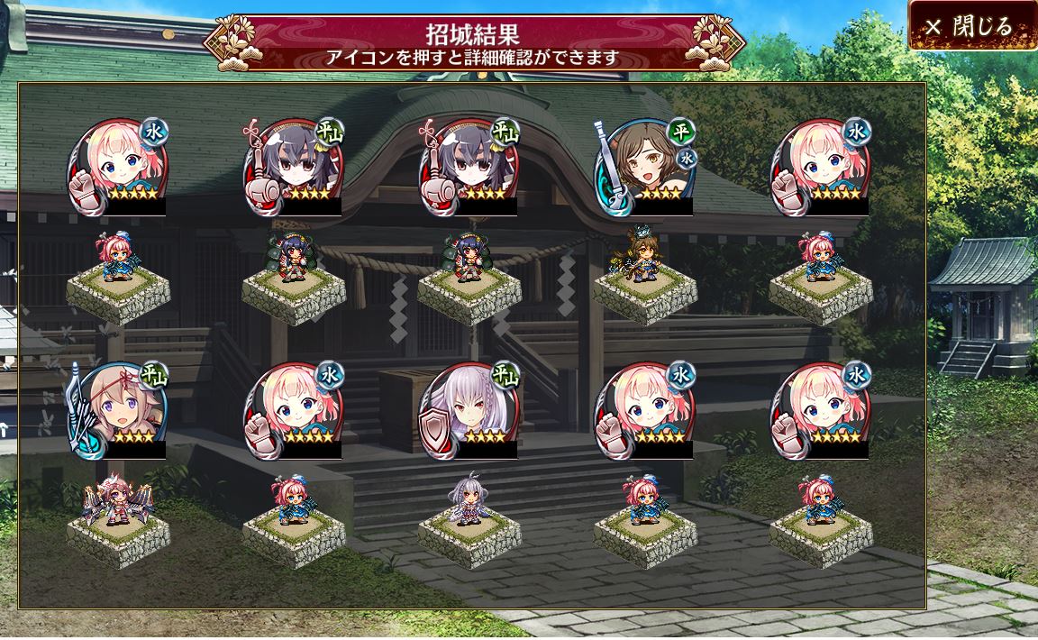 半額10連。1回で★5 5人出るのも初めてだけど、まさか5人中5人が甘崎城になってて吹いた。確率的に★7出るより低そう。既に4凸済みなのに無駄な運を使ってしまった。