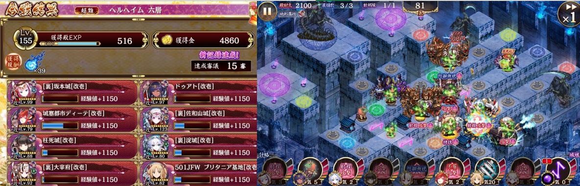 15審。配置は画像の通りで再配置など入れ替え無し、つまりヘルを迎え撃つ最終配置であって、当然ながら魂ギミックは全部倒すので最終強化のヘルと戦う事になる。裏大宰府は射程50剣、王氏は自前ムチでこの二人は魔女化してある。開始は裏坂本と裏淀を最大化しても王氏を3回巨大化させても裏大宰府を巨大化させても何とかなって特に問題無し。道中2か所大破の可能性がある、それは裏大宰府が死神の攻撃を受ける場面とディーテが影ディーテにボコられる場面。前者はフル計略でやられる前に倒せる。後者はトークンにタゲを移させるのとディーテの巨大化回復で凌ぐ。もちろんルーンも使う。そしてディーテ計略を残した状態でヘルとの戦いに持ち込む事が出来れば倒せる。