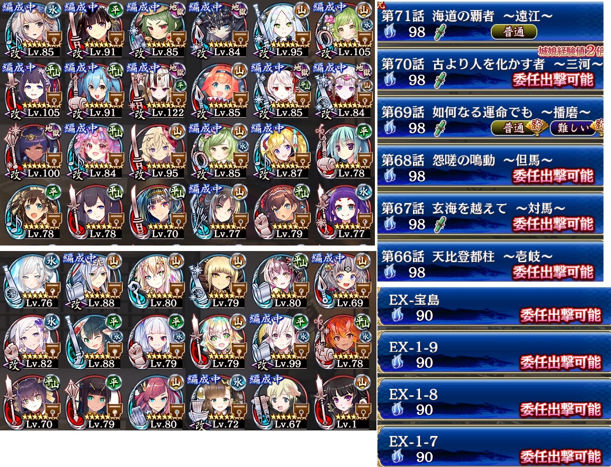 下の枝では星7に言及されてましたので画像を記載しておきます。天下統一と第二部の進み具合も画像の通りです。15審議どころか?10審を狙うのすら全く手持ちが足りないと以前もアドバイスを貰っているのですが…「諦めきれないので挑戦し続けている」そんな感じですね。【現在審議400の殿が私と同じ、★7は画像のこれしかいない手持ちだった場合】300と何十審議まで行けたら、御の字なのでしょうか?ちなみに★6(★7[改壱])でまともな戦力はシャンティイ城、伊豆下田城、白帝城、扇城、大宮丸のみ。★5(★6[改壱])は、そこそこ揃っていますがyoutuberの15審議でよく見かけるLv.100以上は一人も所持しておりません。