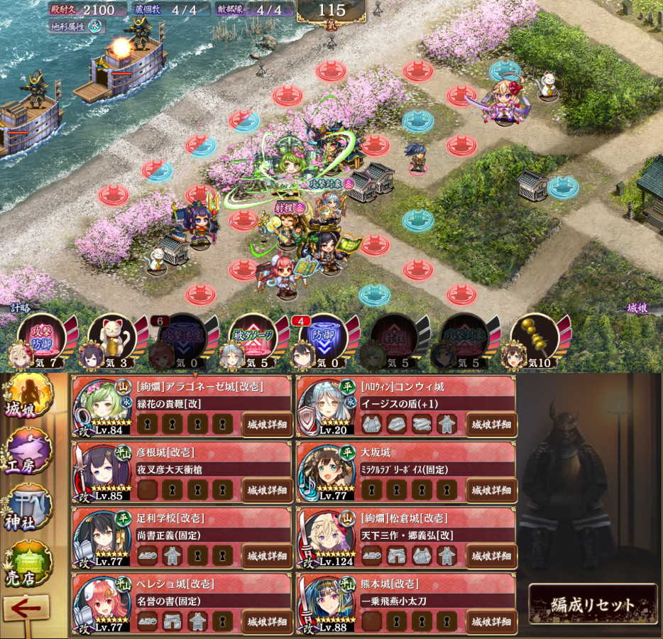 完コピはできないかも知れないけどこんなのとか(難)。舟壊さない場合は最後の力士がかなり重い。力士だけに。最後の力士と右上ルート以外は絢爛アラゴでボッコボコだけど、力士用に補助火力が一体(画像だと熊本城)欲しい感じだった。