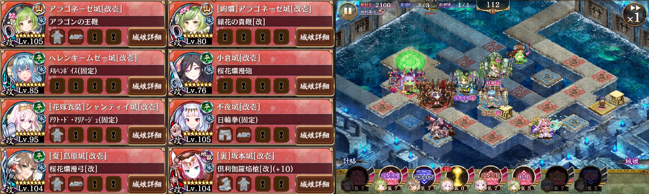 15審議。開幕15裏坂本、18通常アラゴ・シャンティイ配置でアラゴ最大化。絢爛アラゴ・夏島原・ヘレン配置して裏坂本を13に、絢爛アラゴ最大化。絢爛アラゴ計略で金法術対応。夏島原とヘレン最大化したら裏坂本撤退。しばらく計略使いながら進め、左の金法術x2後の爆弾ラッシュ終わったら小倉・4裏坂本配置、裏坂本の計略も使って、左の船壊したら不夜城配置最大化。ネフティス半分くらい削ったら通常アラゴ撤退し光秀に届くとこに再配置。光秀出たら全員の計略使って仕留める。光秀に小倉計略で一撃目は5、10、12が範囲内だけど、2発目からは範囲外になる。一発耐える耐久は必要。あと計略短縮と割合ダメ減が必要だったのでヘレン夏島原採用したけど、割合ダメ減なしで全員が光秀の一発耐えれるなら通常モンサンでたぶんOK。