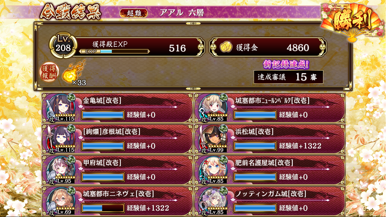 金亀城を16に置いて、雑魚の群れに打ち込む直前に招き猫トークンを置く事で気は余裕。ニュールンベルグの最大化タイミングが一番の難所。