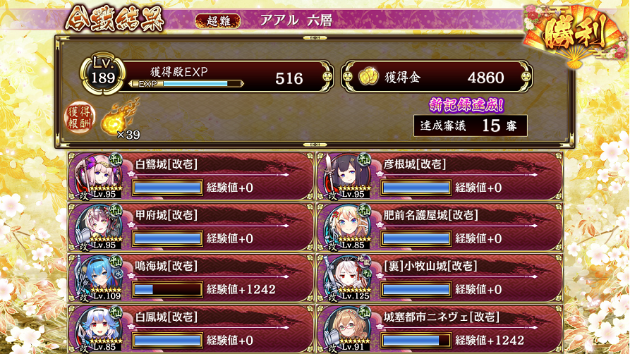 15審。絢爛無し、浜松無し。気が足りないので像発動(発動しなくても行けたかも)。開幕。配置順、16小牧、13備前、9ナム、6ニネ、21鳴海、12彦にゃん、4白鳳。小牧4回巨大化、忍び走り出す前に1回ナム。忍2回目、鳴海特技小牧に、ナム、岩、ナムと小牧攻撃、巨大化で超える。右から走ってくるヤツはそのままほっといて処理できる。間に合わなければ小牧計略点火。後は彦にゃん→備前名古屋の順に巨大化。白鳳計略でミイラと象遅くしつつ、備前名古屋点火してナムとニネ計略で。途中適当に17に白鷺配置しとく。ボスの攻撃モーション入ったら鳴海とニネ撤退、終わり。手持ちほとんど無い人もとりあえず、16に裏小牧(125、光秀銃)、13備前名古屋でほぼ全て焼き払ってくれるよ。
