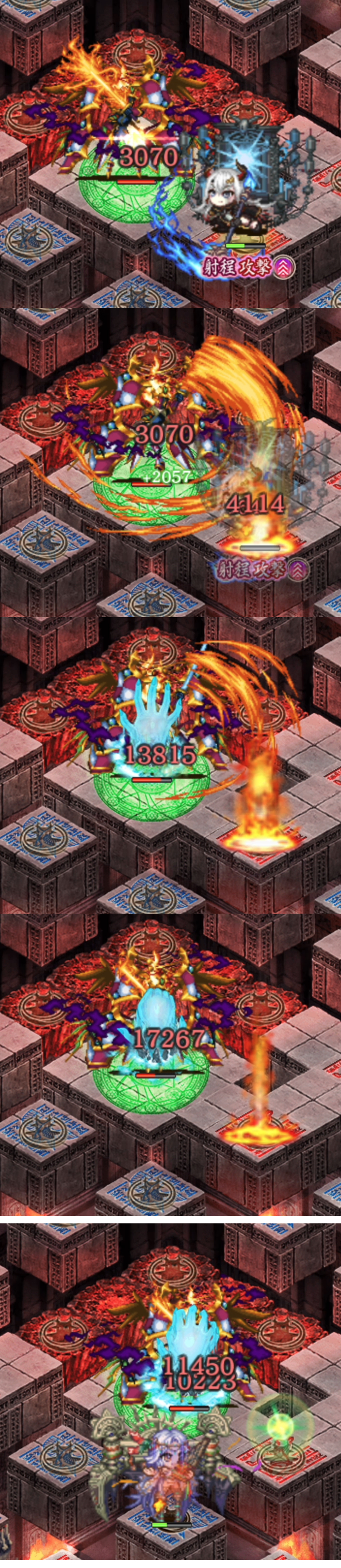 大破二連撃の検証の為、一部審議を外してシュテファンと殴り合い。タルタロスにはシュテファンの一撃で落ちてもらうために夏白鷺の計略を使用。一回の大破で二回ダメージを与えているのを確認。これで自身を撃破した敵、射程内敵が同一だった場合に大破二連撃が発生すると検証出来た。…と思ったんだけど一番下の画像、15審議で地形不一致自爆大破した時にも発生タイミングが違うだけで二連撃になっているのを確認してしまった。法則性がよく分からん。ちなみにヘリオポリス六層はタルタロスと夏白鷺の自爆をメイン火力にして15審議取れた。