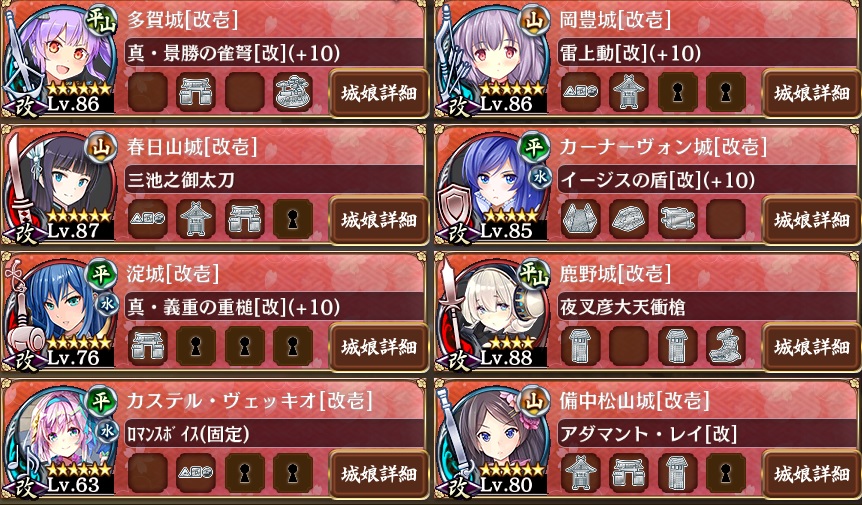 汎用性が高いけれども、いつも10連のハズレで引く城娘は、こんな感じですね。ハズレと言っても、それは絢爛や地獄城娘と比較した場合の話であり…ここに上げた城娘は最高難度の15審議ですら通用する事もあります。どれもこれも育成しておいて損はないでしょう。なお、カステルとカーナーヴォン等は限定期間でしか入手できません。それ以外だとガチャをかなり回さないと出ない気がします。また、絆が0だと滅茶苦茶弱いので改壱にしたら【必ず200にしておくこと】武器も改になっておらず弱いままだと当然攻撃力も低くなりますので。武器も改にしたうえで+値を上げて強化しておきましょう。
