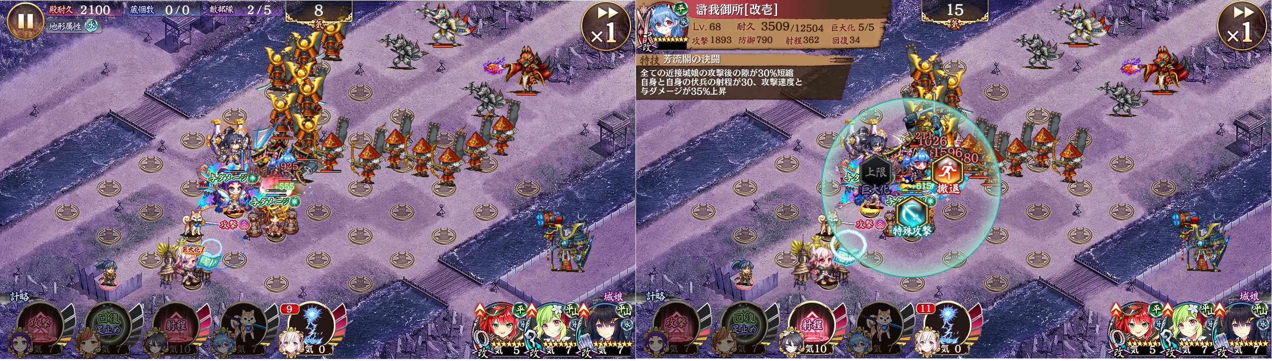 足止めすると受け難易度が大幅に下がるよ。例えば、コトルの計略で足止めを付与して滸我御所で受けることもできる。画像はミリ残しで一発耐えて2発目は特殊攻撃で空蝉する図。雑魚の攻撃に死なず火力が高いキャラなら、あとは2発目を耐えるorその前に倒す算段を整えるだけなので。
