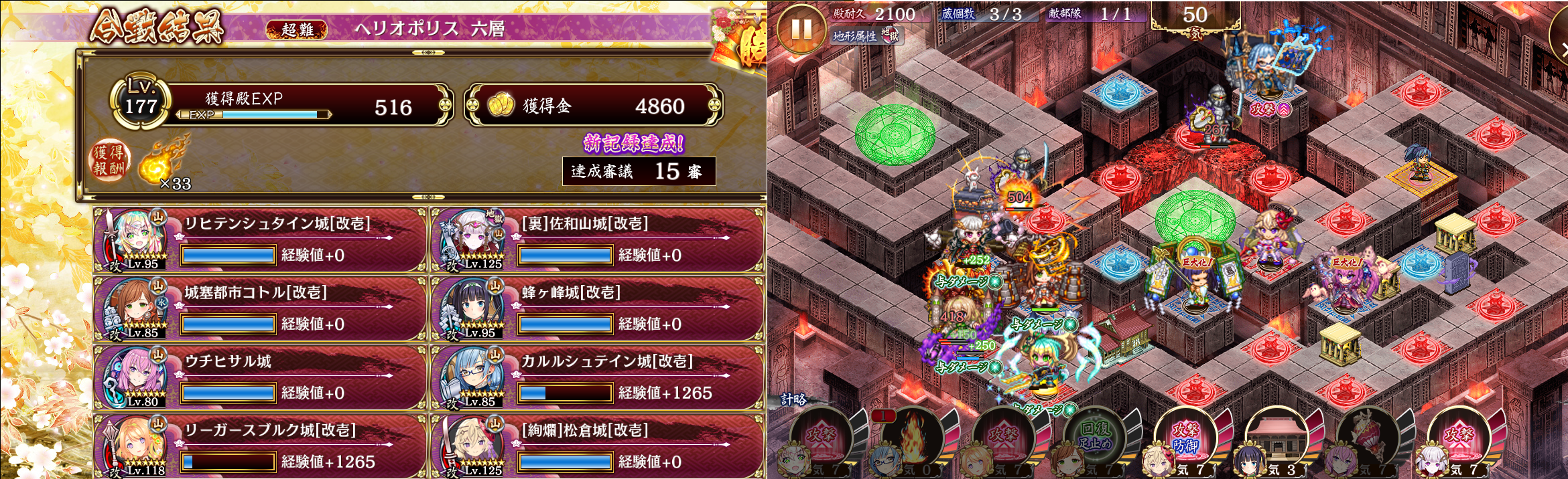 開始後にカルル、蜂ヶ峰、裏佐和山配置。カルル計略1発目で気を稼いでコトル配置、最大化。佐和山は巨大化回復1回くらいで耐えられる。リヒテン、リーガース配置、リヒテン最大化。佐和山リーガースを最大化。ウチヒサル、絢爛松倉配置、松倉最大化。蜂ヶ峰がコトルに届くまで巨大化。ウチヒサル4回巨大化。ラー抱えながらシュテファン以外を撃破。シュテファン登場、ウチヒサル特技と佐和山計略で大方削る。ワープ後はアンサラー松倉ウチヒサル蜂ヶ峰で削りきれた。