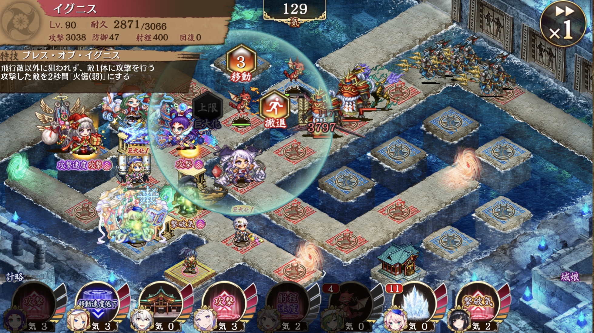聖夜リズランのイグニスくんをレベル90まで上げて、聖夜モンサン、聖夜冬宮殿、ミシシッピ、竜ちゃんでバフったら、3000バリア突破できた。頼もしい!