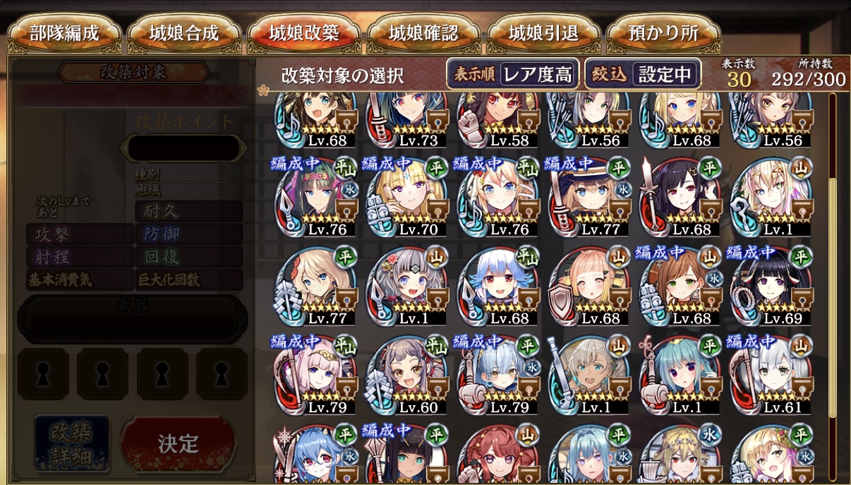 改築素材が3体分あります。みなさんならどの城娘から改築していくか意見を聞かせてください。地獄5層4審が安定してクリアできるようになりたいです。