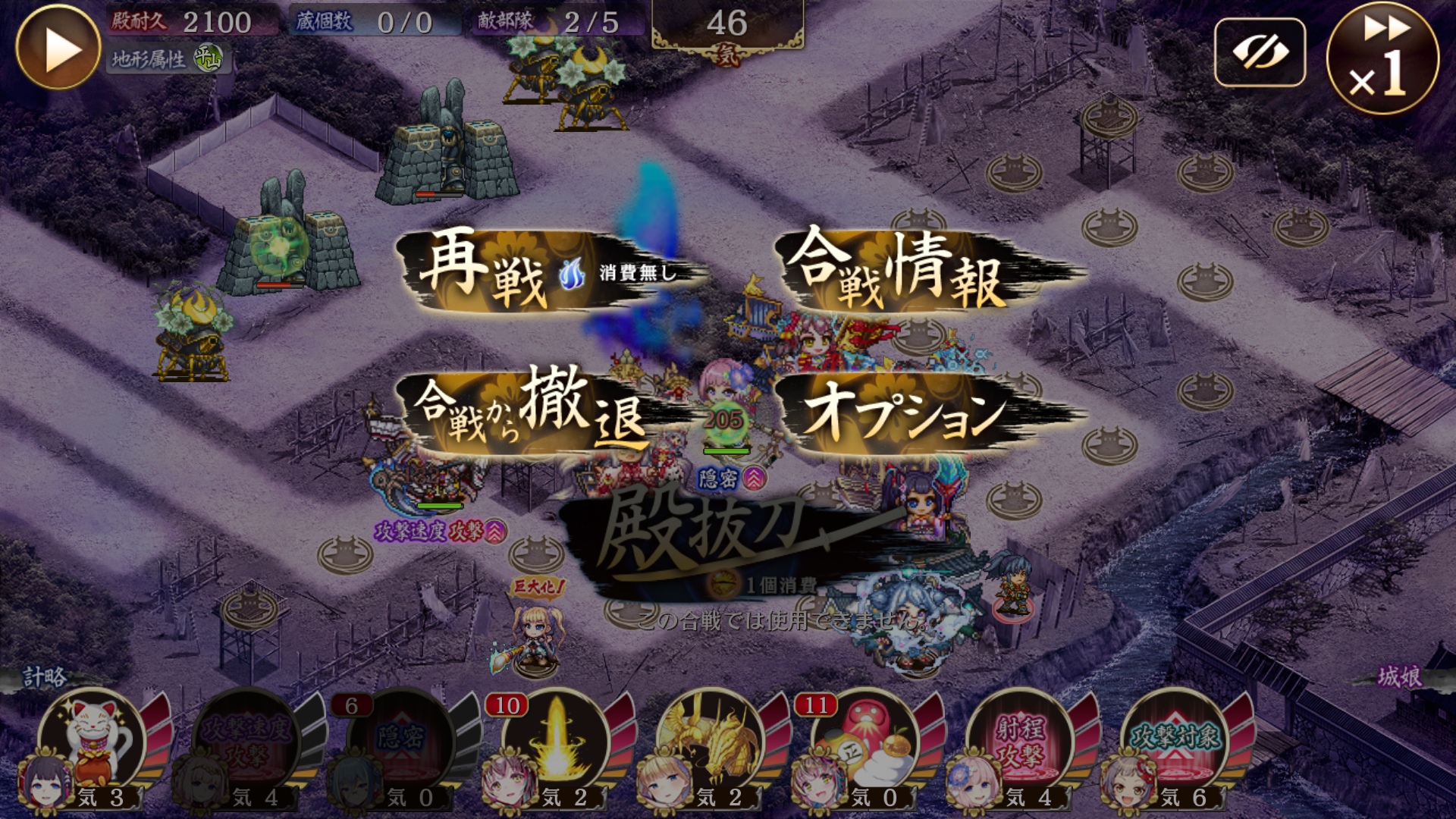 武神早期撃破の人ってあまりいないのか?10夏白鷺、8正月徳川伏見、3白鷺。最大化白鷺が徳川伏見計略中のみ武神に届くので2Wで虎2体倒してから割と自由なタイミングで武神撃破。後は消化試合。