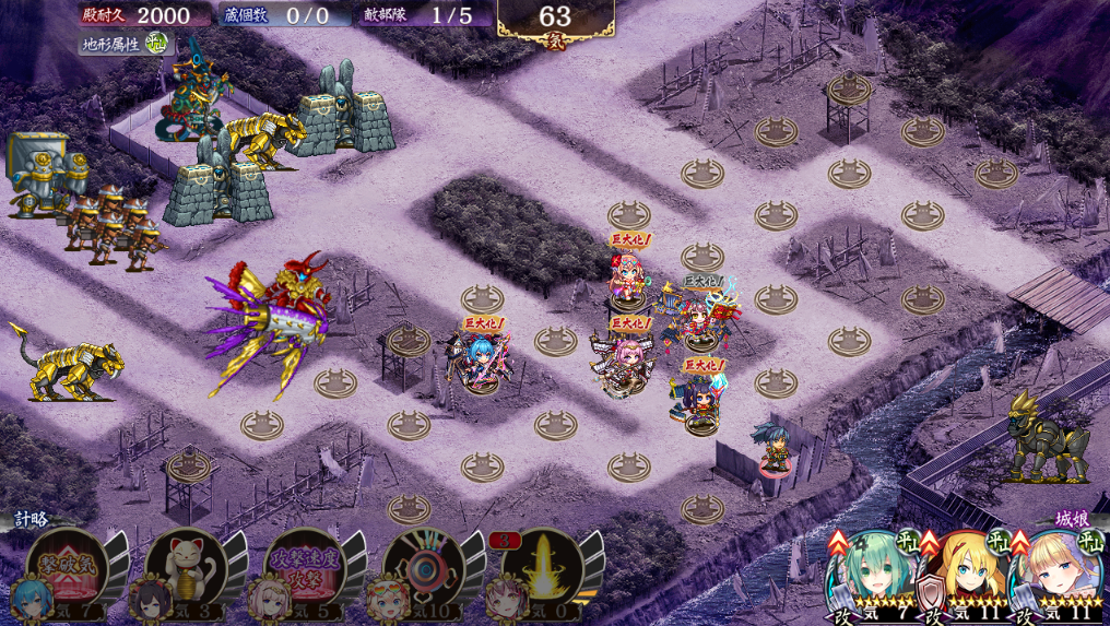 最初はこれ。白露最大化後殿の左に岡崎。w3開始時、4に絢爛佐倉。最初の石壁倒したら、10にコーブルク。コーブルクの巨大化で加藤の攻撃を耐える。加藤と石壁撃破後、絢爛佐倉を30へ移動。右紫毛虫倒したら絢爛佐倉を再び4に移動。大まかな配置場所とタイミングはこれです。