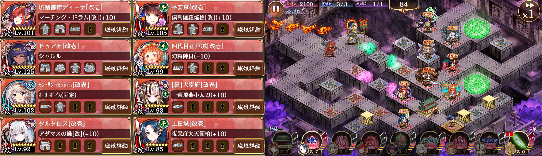 15審撤退再配置無し。裏太宰→モンサン→ディーテ→平安→タル子→ドゥアト→上田の順で最大化。マーチングディーテが全てを屠って気を稼いでくれた。強い…