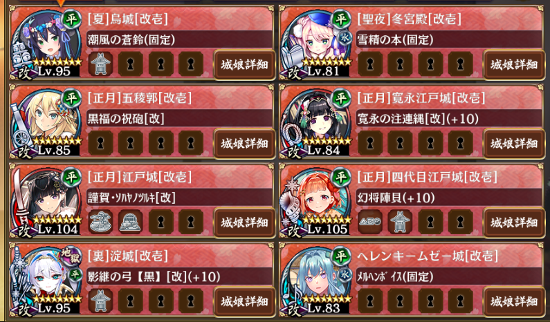 これが正月五稜郭を入れた最強編成じゃー‼夏烏も鈴だから隙短もともと意味ないので正月四代目バフの方が火力アップして相性めっちゃいいでぇ