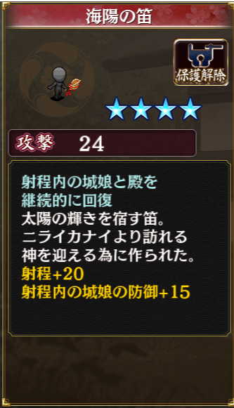 交換の海陽の笛。射程+20付くーと思ったけど自分のみだった。バフがギリ届かない時いいかもね。