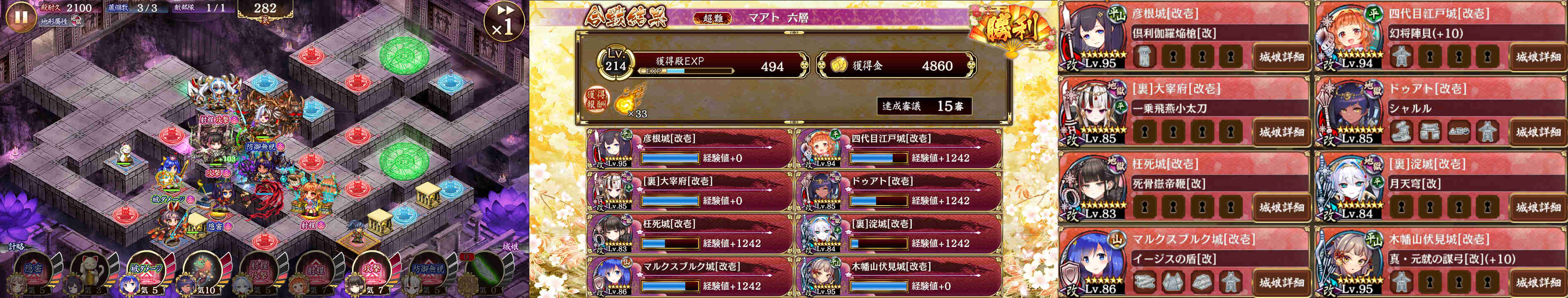 15審。木幡山使用の動画を元に盾を変更。終盤の彦根以外同じ配置。5木幡山、12→8彦根、16四代目、19→7おうし、15→10裏大宰府、11ドゥアト、6裏淀、4マルクス。