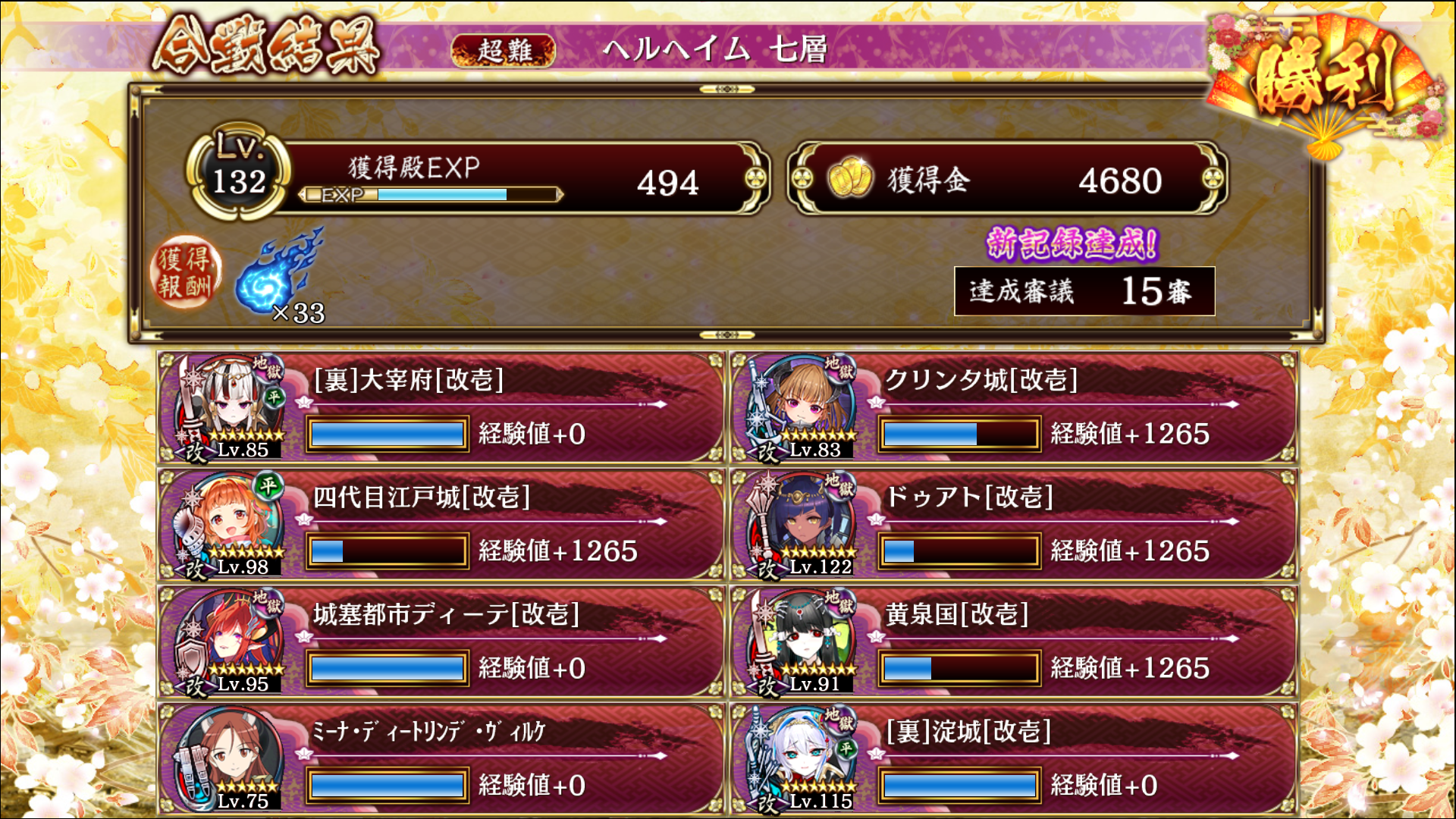 審議の地獄城計略40%短縮と黄泉国の計略35%短縮とミーナの計略15%短縮全てを注ぎ込む事で黄泉国の範囲不死の計略が完全単独永続化出来た。ここでしか使えない戦法だけど勝ちは勝ちだ。