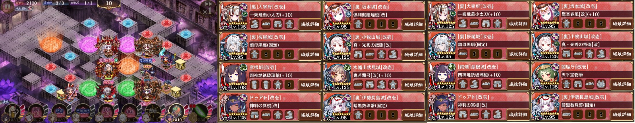 裏小牧山でごり押す15審。8からは裏小牧山に光秀改と裏桜尾計略と射程+36で届く。施設ではコラボ除くと+19(+34)が限界。彦根の場合は裏坂本に倶利伽羅槍で伸ばす。木幡山は防御&被ダメデバフと最後の蔵隠し。絢爛彦根がいるならラケットが使えるからそっちの方が簡単。配置は木幡山を閻魔に