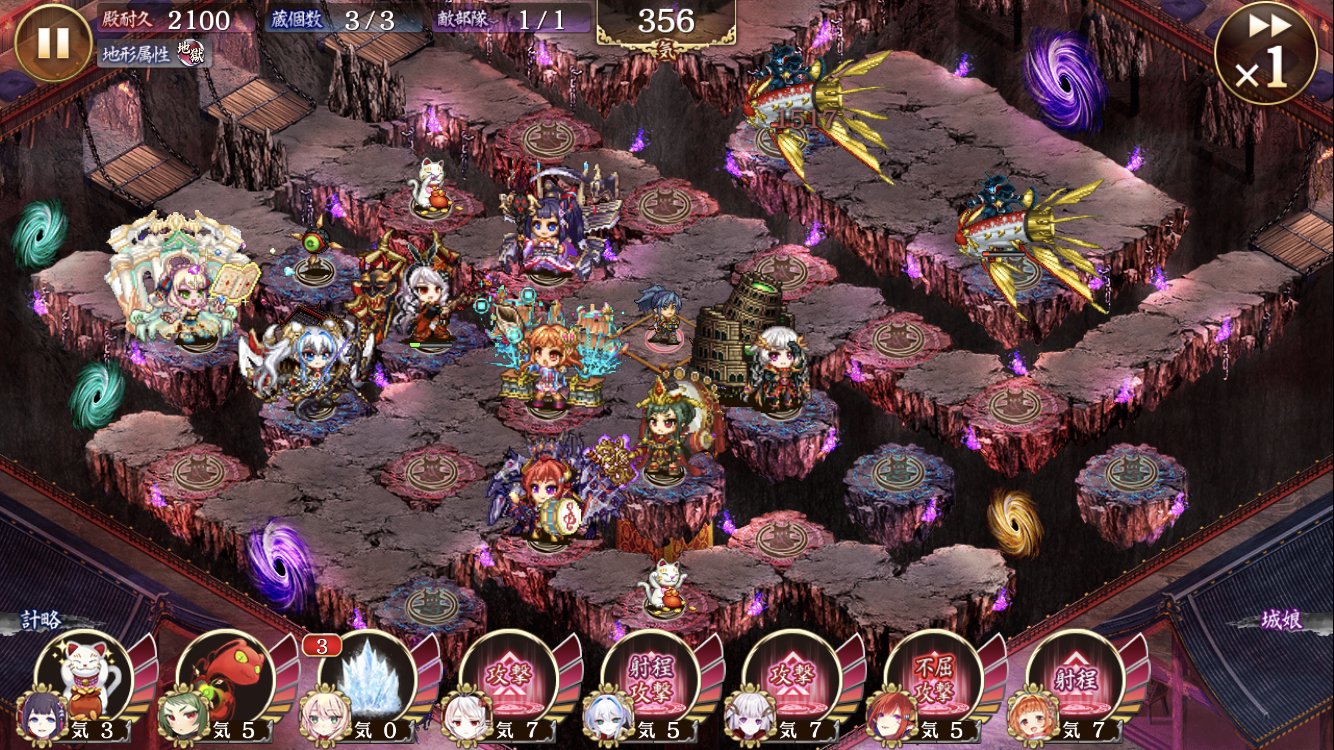 15審。絢爛彦根、裏小牧、四代目、ディーテ、裏淀、冬宮、閻魔、裏佐和山。最終盤面画像。裏佐和山は3で閻魔を迎え撃った後画像の位置にお引越し。冬宮の射程デバフと閻魔の鈍足により閻魔の攻撃を1回のみで抑える。ディーテは初手中央で妖怪を抱えた後、閻魔迎え撃つ直前で画像位置に引越し、計略溜まるのを待って閻魔を集中砲火で落とす。冬宮の計略がやはり結構強い、閻魔にも氷は効くようだ。