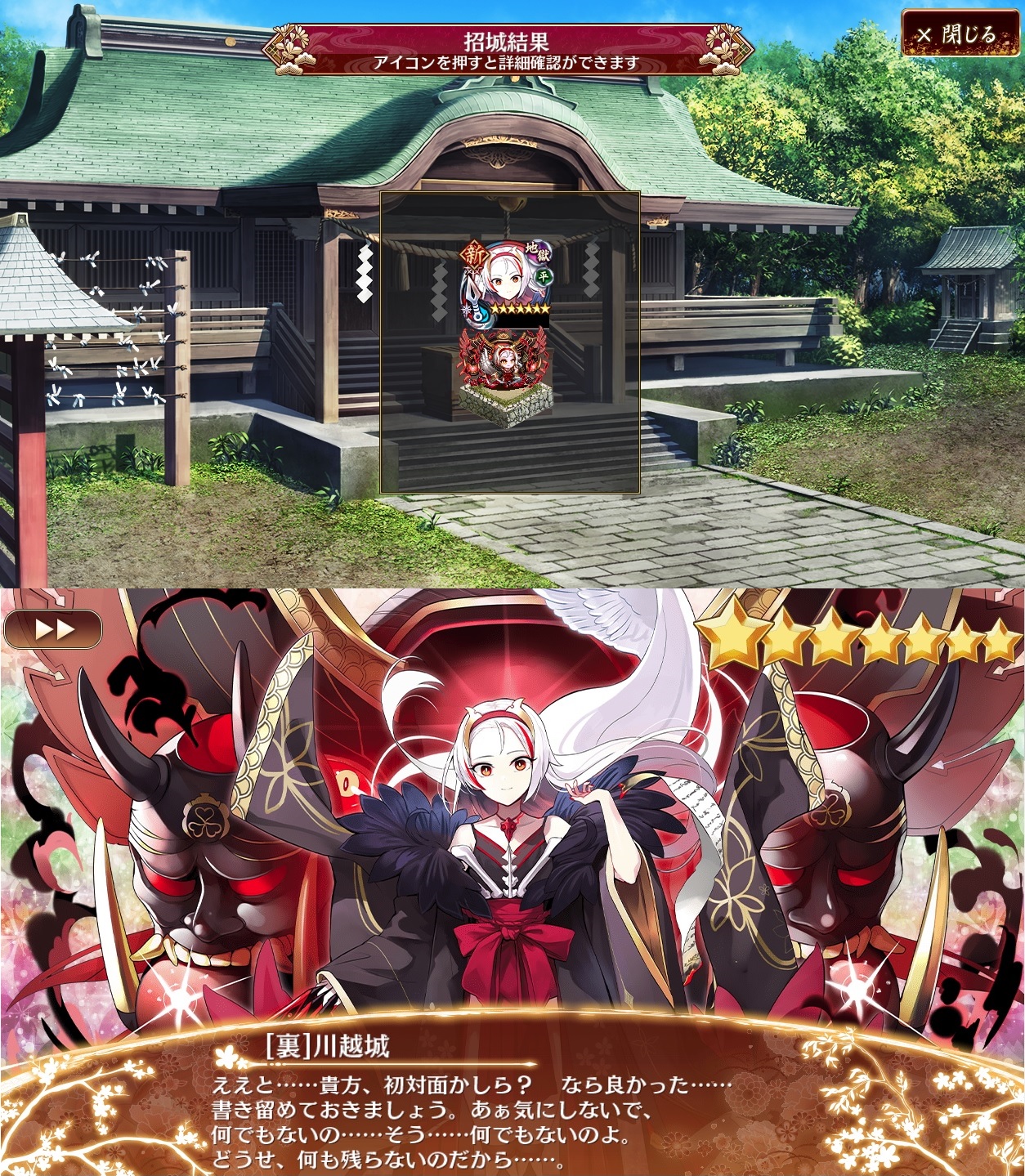 1日1回無料招城で来てくれた。ちなみに、初回にいきなり☆7平城京と、以後も☆6扇城が来てくれた。今回、もしかして虹珠が出やすくなってる?……と、うれしいなと思う。