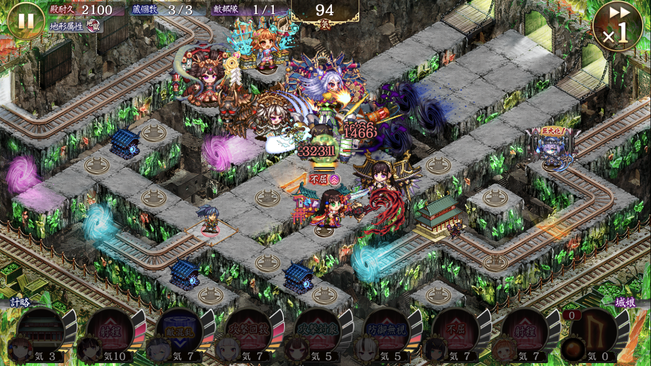 15審。四代目、太宰府、裏太宰府、不夜、平安、江戸、ウルク、チリンガムorラムリー(自由枠)。再配置なしの最終盤面画像。不夜の耐久と火力を上げて中ボスに打ち勝てるように、炎吐いてくる奴はチリンガム計略か江戸計略、平安トークンで不夜の負担軽減できる、無策だと不夜死ぬかも。チリンガム使わない場合はラムリーで計略再使用軽減も有効(クリア確認)。