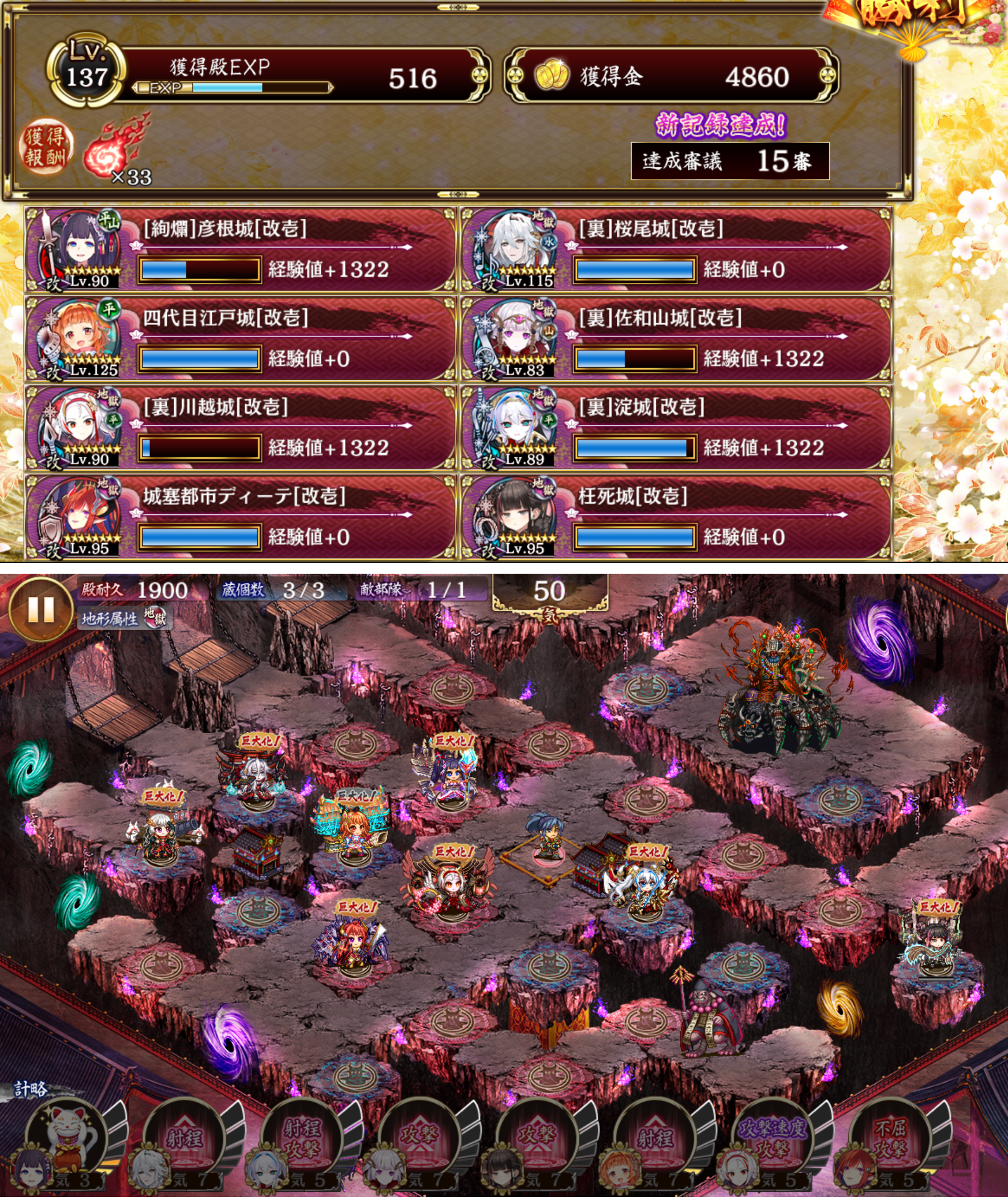 裏川越、裏桜尾はいいぞ(いいぞ)。最初の立ち回り:ディーテ裏桜尾は三段階までで止めておいて、犬神の攻撃食らうたびにディーテを巨大化して四代目計略と同時に自身の計略発動。23発までは撃てる。初期配置参考で裏澱出しているけど、実際には犬神が来てる間は配置しない。右上の象倒し終えたらおーしは17へ移動して対空戦闘。