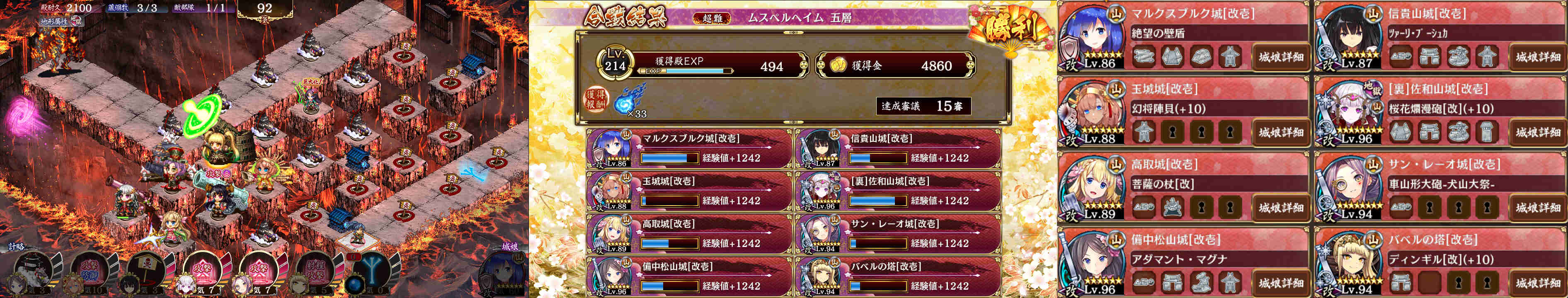 15審。サンレオ使用動画を参考。配置は10玉城、13びっちゅま、6バベル、3サンレオ、7信貴山、1裏佐和山、2マルクス、4高取。マルクスは黒獅子からの攻撃で巨大化回復をした後、空蝉をしている(巨大化は3まで)。