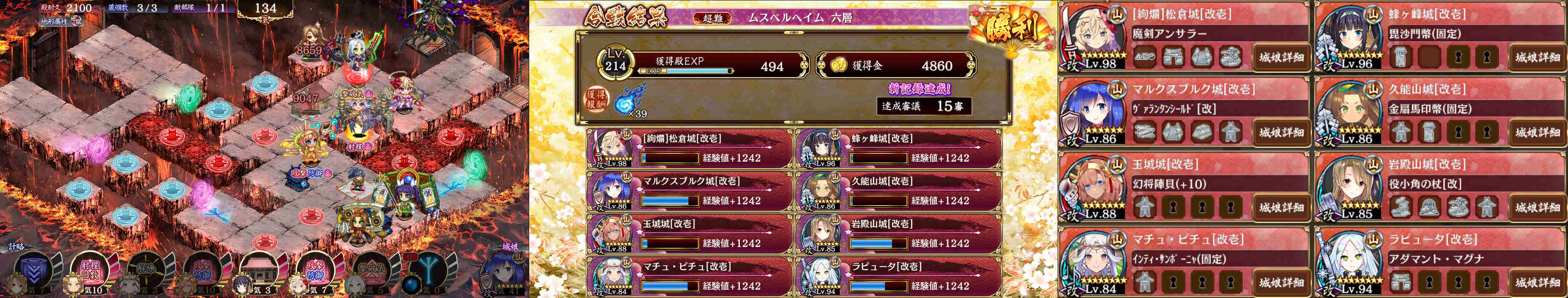 絢爛松倉使用動画を参考に15審。配置は20蜂ヶ峰、13玉城、16マチュ、18絢爛松倉、8→15ラピュ、17久能山、14マルクス、6→11岩殿山。15と12に神社。さらに発展させたいと思いました。