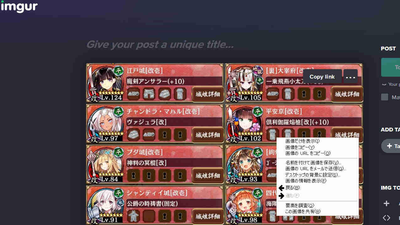 そのurlで表示される画像を右クリックして「画像のURLをコピー」が出ませんか?それを選んでペーストしたurlが直リンです。「画像の情報を表示」でもurlは出ます。今のimgur仕様だと画像右上の「copy link」から直リンは取れないみたいです。↑リンクだと自環境では表示されずソースから探せたのが編成のみで、配置が分かりませんでした。(添付画像)