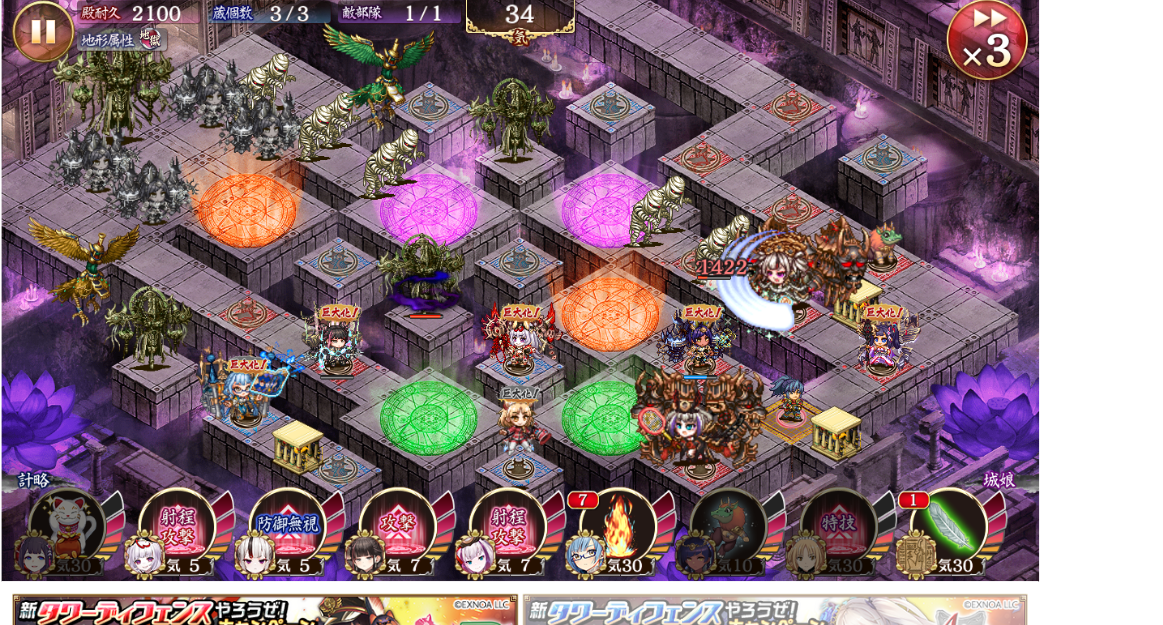 右と序盤左下を裏太宰府で倒す。最後はブリ基地で射程伸ばした枉死が左と右の分身を破壊。ラーはカルルで空蝉。カルルと絢爛彦根の射程バフがかなり大事。ラーは動き出す前に半分ぐらい削れる。オシリスはラーの空蝉対処している間に勝手に死んでたからよくわからない。裏坂をラケットにすることで裏太宰を計略なしで最大化できる。裏太宰は1個前に出しちゃうと左下の攻撃ができなくなるから17に置いておく必要があった。スクショは序盤の配置(ブリ基地の移動しかない)