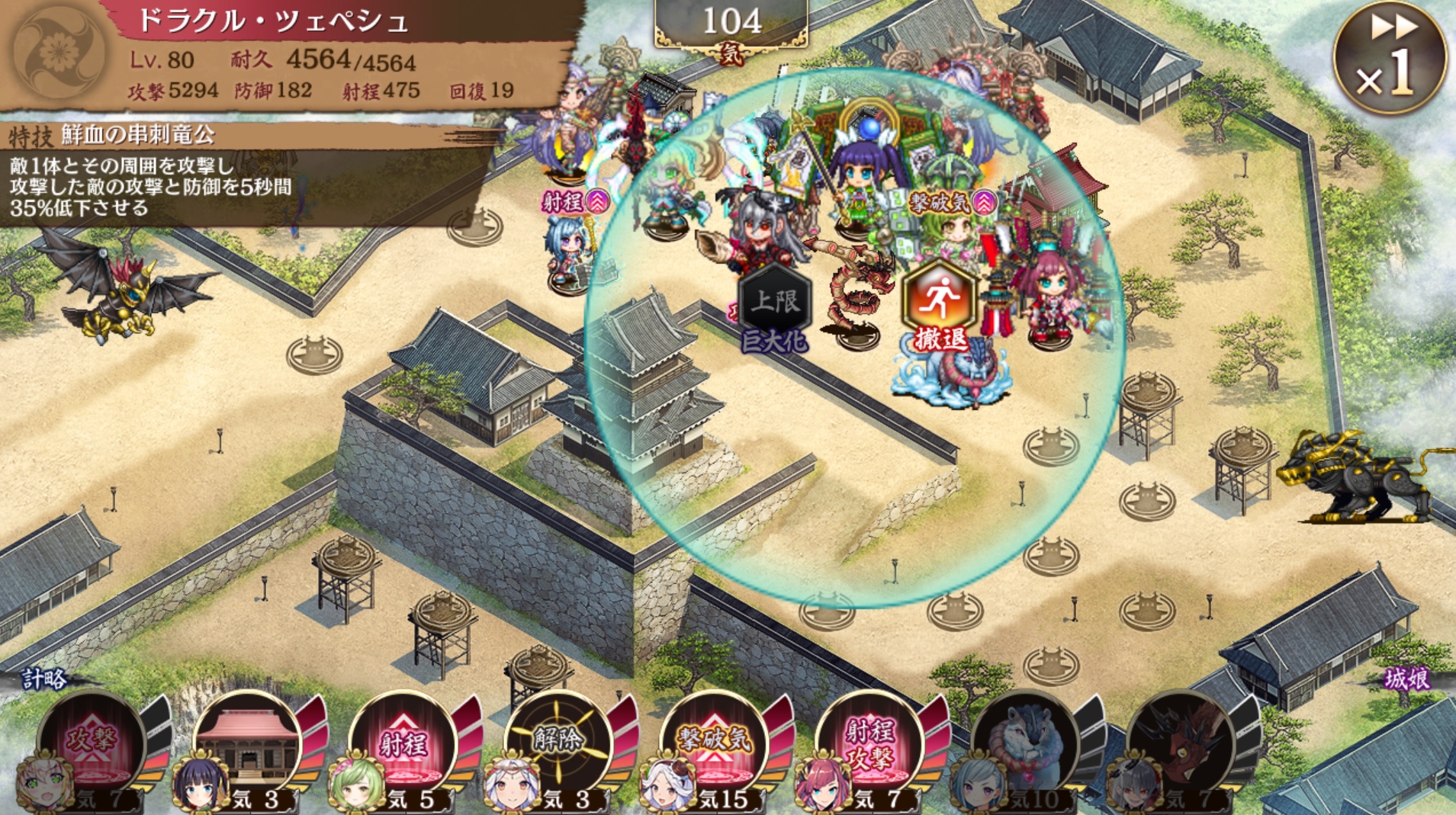 攻撃と射程バフ多めの攻略できそうな編成。耐久面が柔らかすぎるので、生存させるなら囮トークンは必須かな?絢爛アラゴ攻撃3000、蜂ヶ峯攻撃2400と全体的に攻撃高め。千方窟入れたら攻略はもうちょっと強りそう。