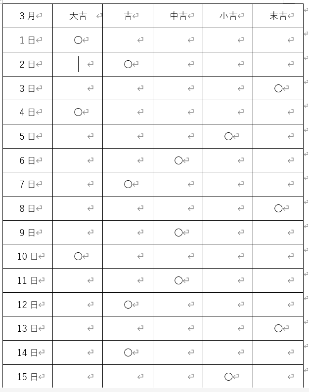 とりあえずひと月分のおみくじ結果残してみたんだけど一人分じゃあんま意味ないか。最高何か月分追ってたりしたんだろうか。先達の殿たちは。