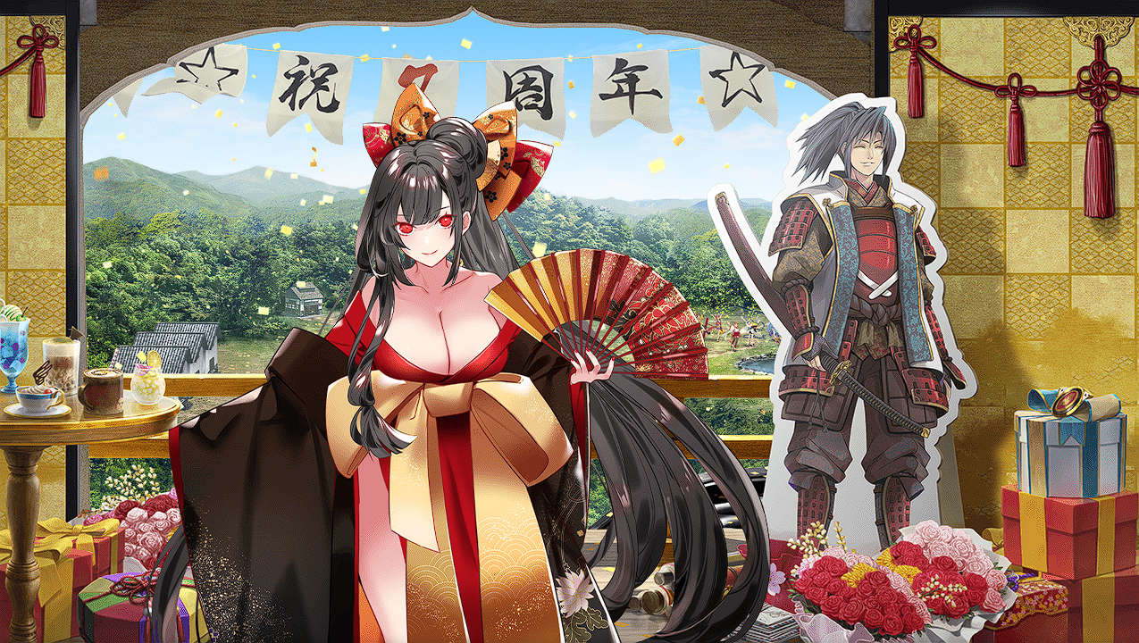 立花山城ならぬりっかさん嬢。見せつける胸囲、ブーケにしか見えない花束、横の殿パネルが合わさって、すぐ後ろで襖が開いているのに色々重い。こんなヘタレ殿に誰がした!出てこい道雪兜!!