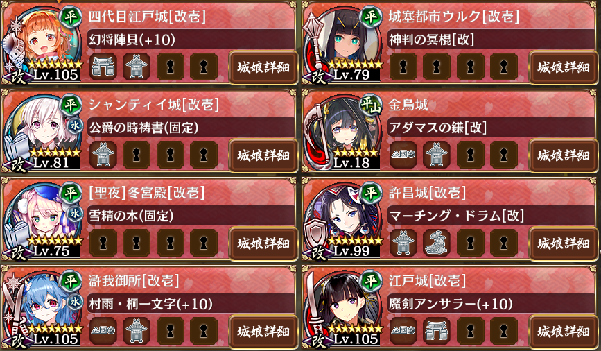 15審クリア、8ウルク、9ウルク、10冬宮殿、11許昌、12四代目、13シャンティ、15コガ。コガちゃんに許昌計略使、冬宮殿の計略は大鹿2体同時、2体目の一ノ谷に使ったくらい