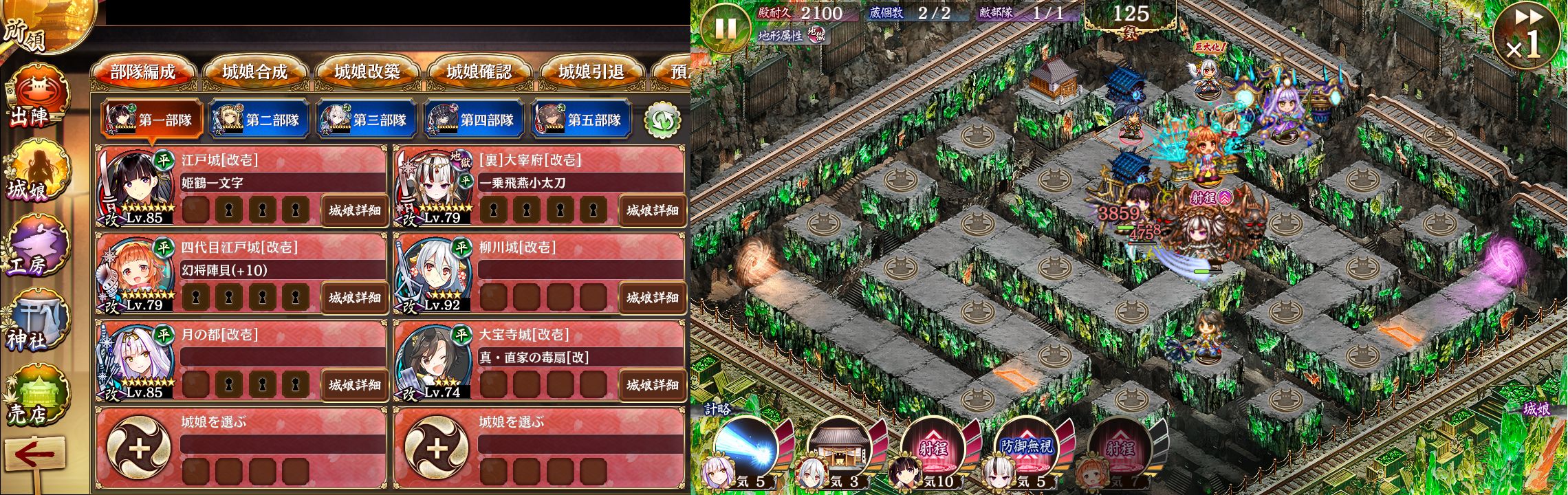 ここはトークン系城娘がいると楽そうだけど、ほとんどが恒常落ちか季節限定なのがたちが悪い。自分はろくなのを持ってなかったので、裏大宰府と江戸を主軸に月の都でCT短縮してごり押しした。↓はいろいろ詰めた結果の画像。