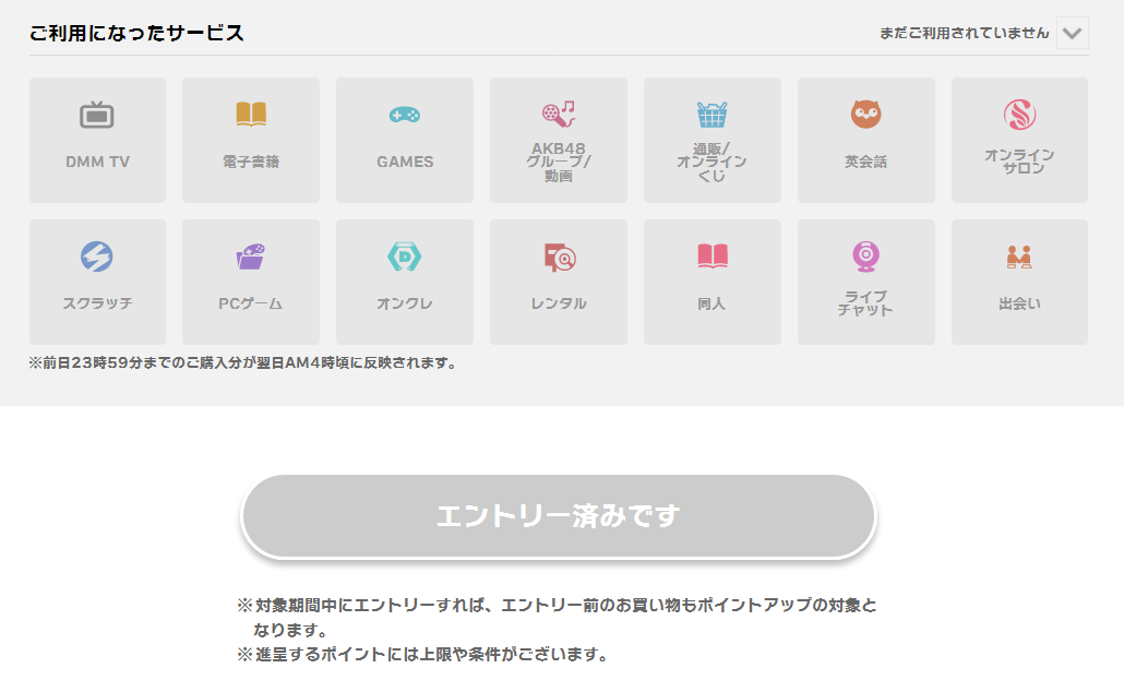 エントリーして複数サービス使ったのに「まだご利用されていません」あれ?反映されてない?と思ったら翌日4時以降に反映されるのね。問い合わせのお姉さんに迷惑掛けてしまったわ