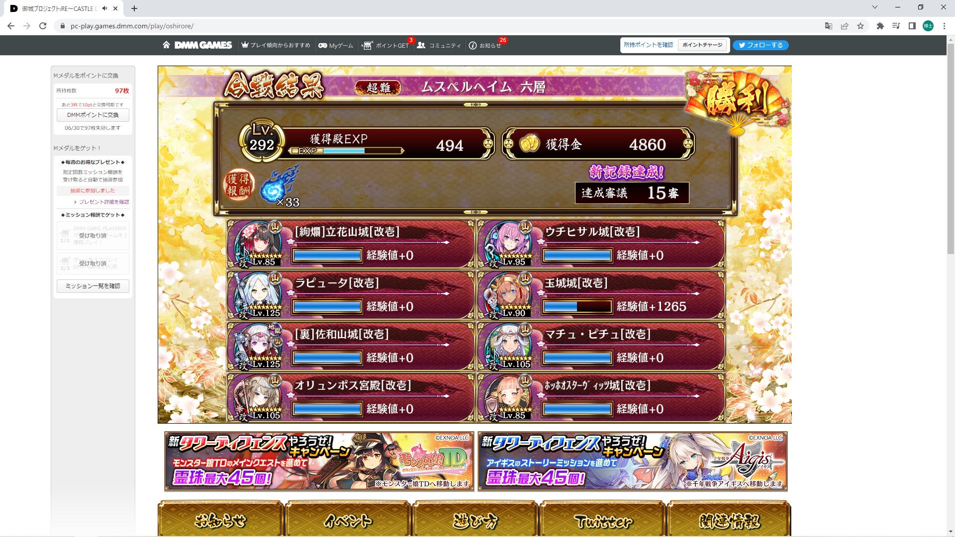 冗談抜きで100回近くやったかも。細かく死にポイントあって辛いね。特にボス前の3体がかなりきつい。一応ポイントとしては裏佐和山の射程減で蝶のスリップダメ防ぐの&計略の超火力、玉城城の被ダメアップ&ステアップ。ボスはウチヒサルがいれば瞬殺できるね。