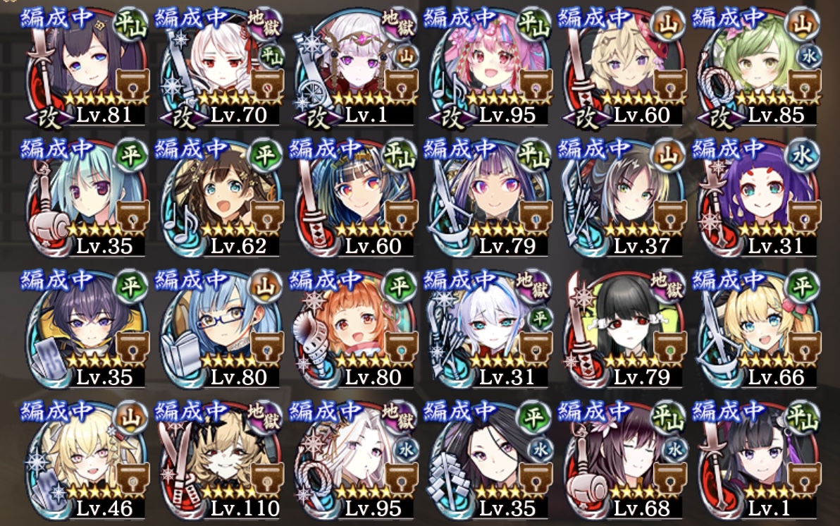 2週間ほど前に始めた初心者殿です。以前、育成について相談した際にシバルバーの改築の発表を待ちつつ、復刻2週目の裏坂本を狙うようにアドバイスをいただきました。手に入る限りの霊珠を使っても残念ながら裏坂本は出なかったのですが、少しラインナップが増えたので改めて育成について相談させてください。画像のような手持ちの場合はどのような汎用編成を組むのがオススメでしょうか?また、星7ススキが1つ残っていますので、そちらの使用先もアドバイスいただけると嬉しいです。