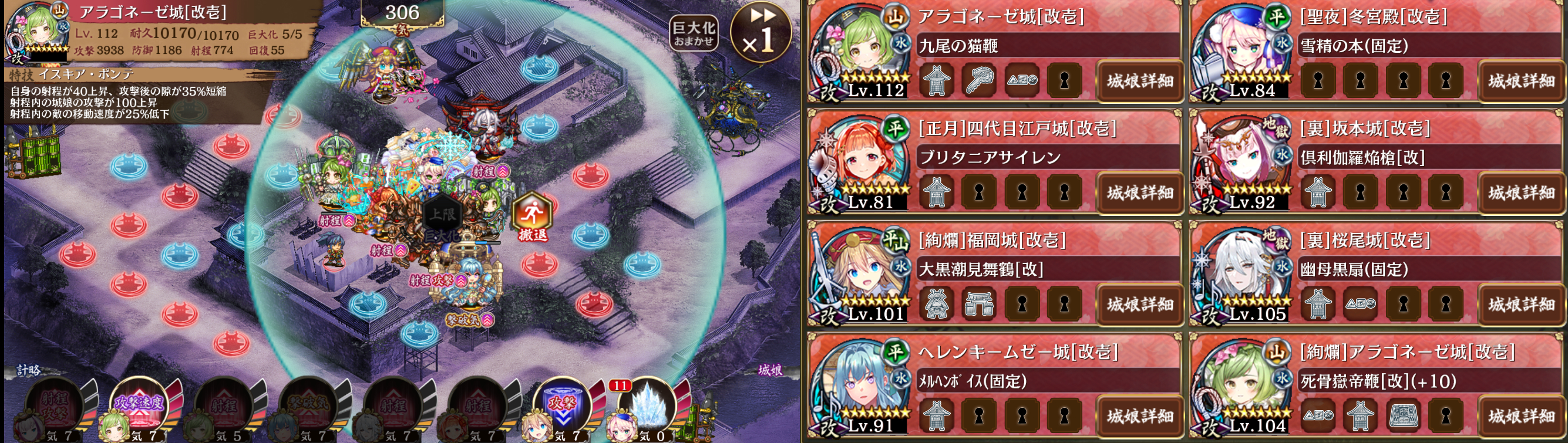 絢爛福岡以外を配置して裏坂本→アラゴを巨大化。最初の右からの妖怪集団が来てるときは裏坂本、裏桜尾、アラゴの計略をかけておく。その後は絢爛アラゴを巨大化しつつ絢爛福岡を配置し、福岡、ヘレン→桜尾の順で適宜巨大化し、適当に計略をかけていれば終わる。武神化した高虎くんに絢爛福岡の計略かけると相当楽な気がするが忘れてもたぶん大丈夫。
