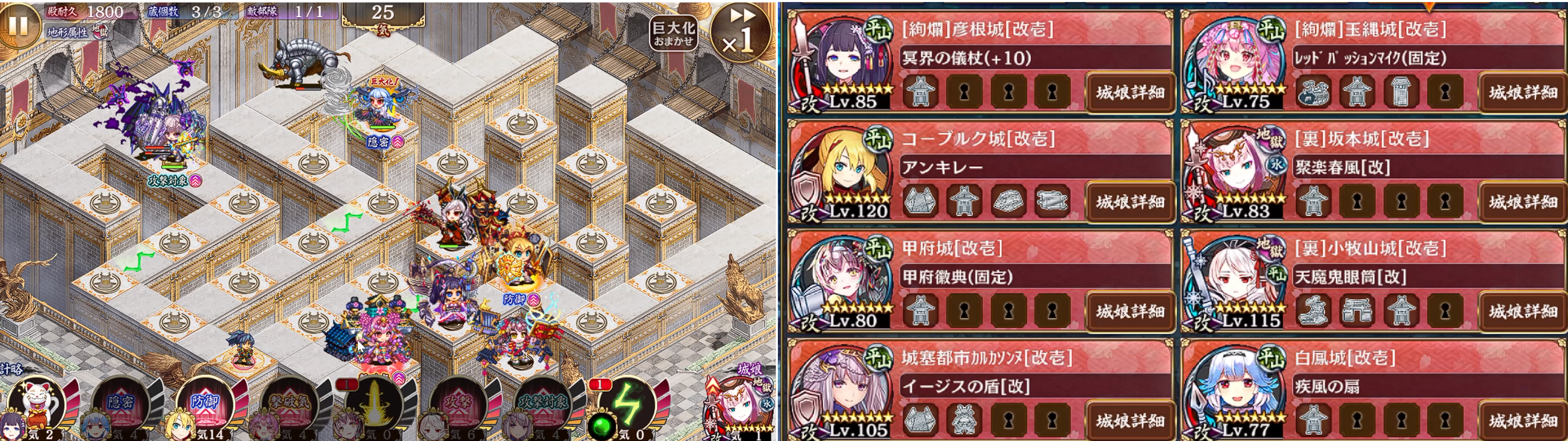 17審。配置換えなし。施設をつけると初めの蝙蝠に彦根小牧山玉縄の計略が間に合う。持っていないので試せていないが光秀の叛砲があると右側の処理は楽になると思う。