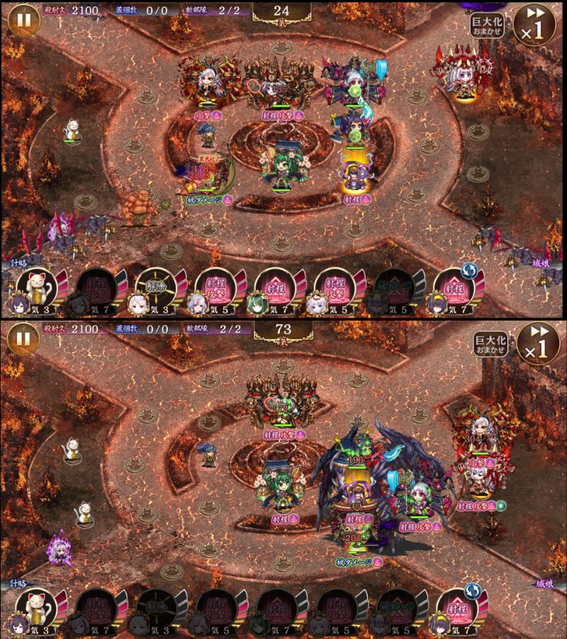 序盤はリンネ裏小田原裏伊勢長島以外を配置して裏坂本裏小牧山を2回巨大化して小牧山と坂本の計略で薙ぎ払う。坂本小牧山の計略はほぼ常に使いっぱなしでそれぞれ配置最大化(真田丸以外)しつつ必要なら個別に計略を使う。 ニーズヘッグは真田丸の計略の切れ目に注意が必要だけどみんなで殴れば何とかなる。