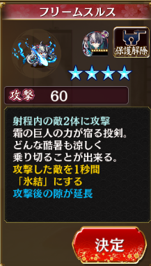 ☆4 フリームスルス 攻撃60 射程内の敵2体に攻撃 攻撃した敵を1秒間「氷結」にする 攻撃後の隙が延長 これは……やべー武器だな?